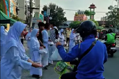 PELAJAR – Suasana menjelang waktu berbuka puasa sering kali diwarnai aktivitas masyarakat yang masih berada di jalan. Sebagian orang masih bekerja, sebagian lainnya sedang dalam perjalanan pulang ke rumah. Ada pula yang belum sempat membeli makanan untuk berbuka puasa. Situasi inilah yang menginspirasi para siswa untuk berbagi dengan sesama.